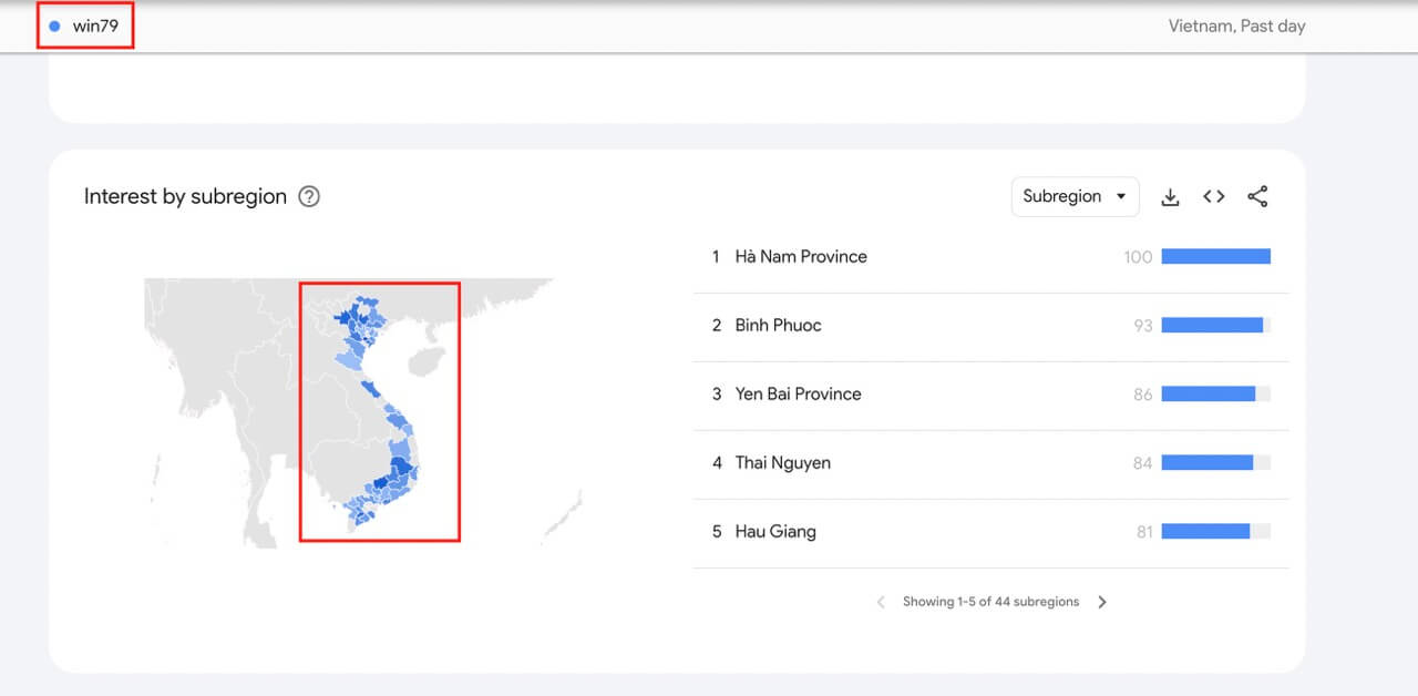Kết quả cho thấy, người chơi tìm kiếm Win79 trải dài từ Bắc đến Nam.