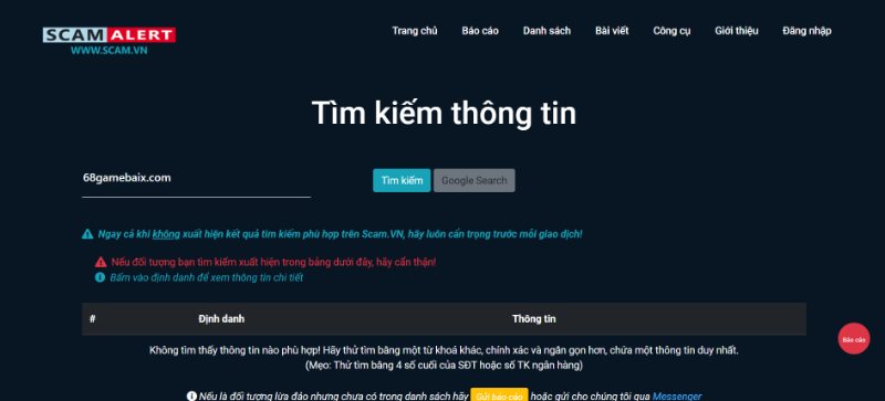Hiện giờ có rất nhiều website chuyên lập ra để tổng hợp danh sách cổng game lừa đảo. Tuyệt nhiên khi tra cứu tên game bài 68, anh em không hề thấy xuất hiện chứng tỏ địa chỉ này trong sạch.